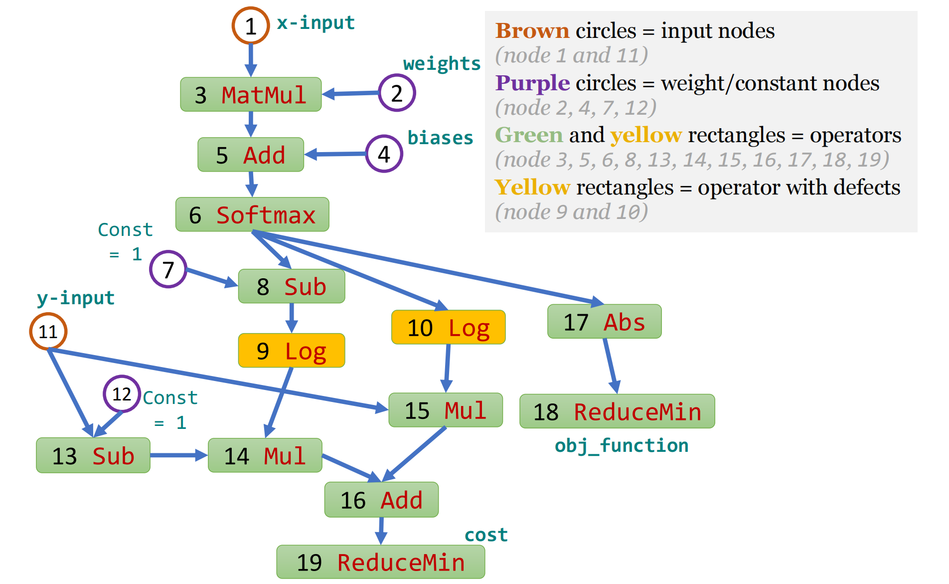 Definition. For the given computational graph \(\mathcal{G} = \langle\mathcal{V}, \mathcal{E} \rangle\), if there is a node \(n_0 \in \mathcal{V}\), such that there exists a valid input and valid weights that can let the input of node \(n_0\) fall within the invalid range, we say there is a numerical defect at node \(n_0\). Formally, \(\exists \mathbfit{x}_0 \in \mathcal{X}_{\textsf{valid}}, \mathbfit{w}_0 \in \mathcal{W}_{\textsf{valid}}, f_{n_0}^{\textsf{in}}(\mathbfit{x}_0; \mathbfit{w}_0) \in \mathcal{I}_{n_0,\textsf{invalid}} \Longrightarrow\) \(\exists\) numerical defect at node \(n_0\).