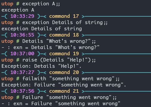 let lst_hi = Cons ("hi", Nil) (* similar to ["hi"] *)Exceptions
