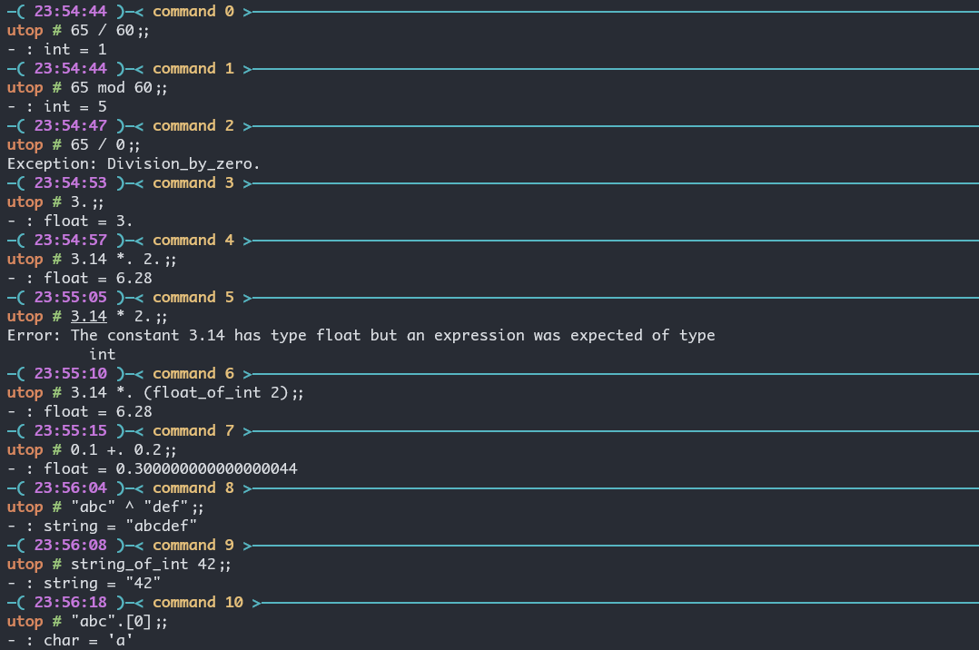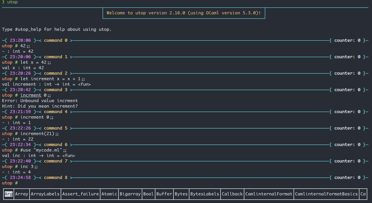 opam install -y utop odoc ounit2 qcheck bisect_ppx menhir ocaml-lsp-server ocamlformatYou should now be able to launch utop, the OCaml Universal Toplevel.
