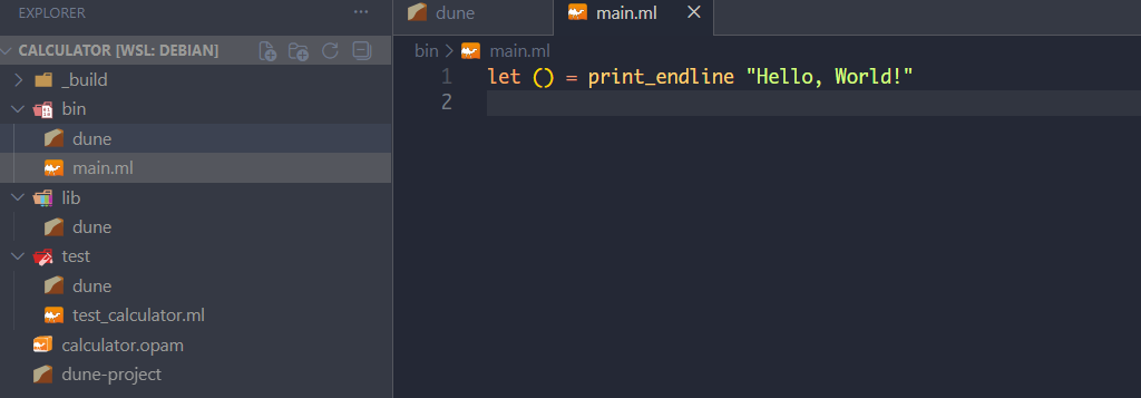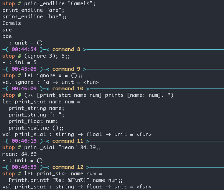 现在我们开始在文件里写一些代码: - There is no double semicolon ;; at the end of that line of code. The double semicolon is intended for interactive sessions in the toplevel, so that the toplevel knows you are done entering a piece of code. There’s usually no reason to write it in a .ml file.