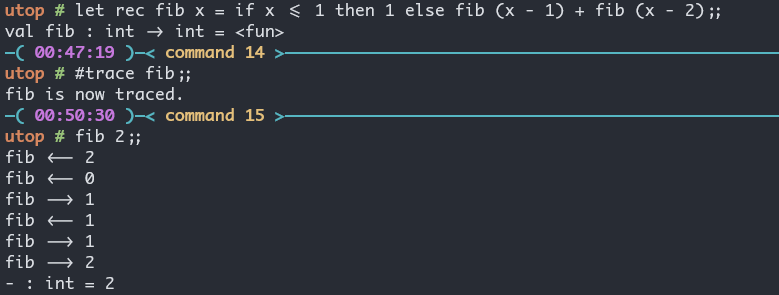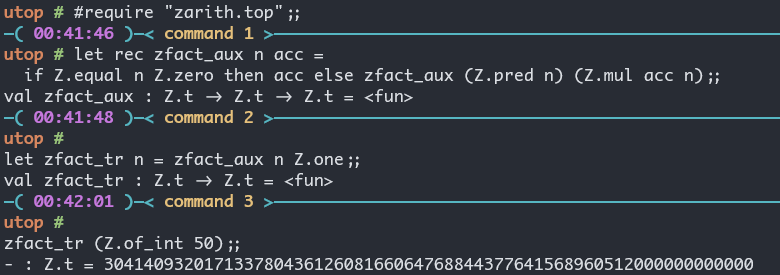 let fact_tr n = fact_aux n 1但是这实际上会遇见 integer overflow. \(\rightarrow\) opam install zarith (Ocaml 的大整数库)