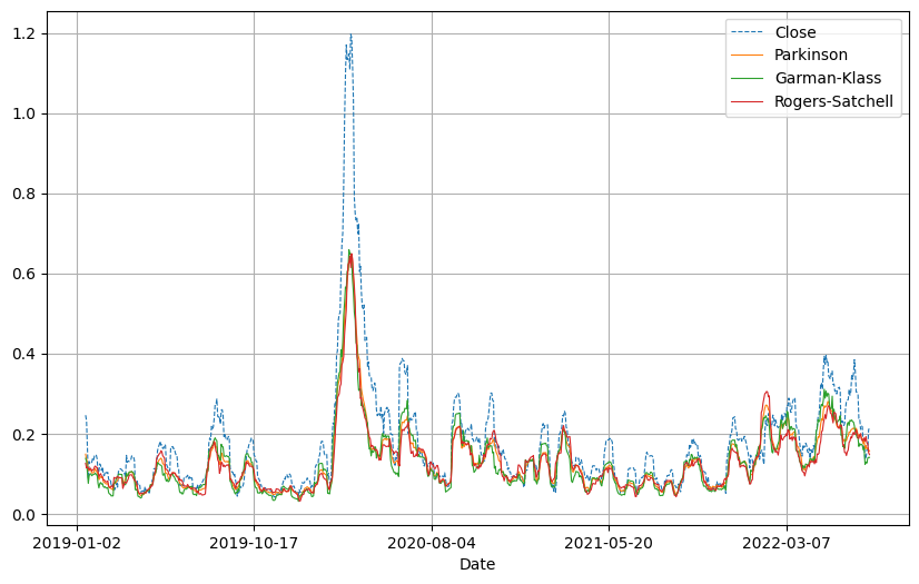 - Garman-Klass 模型: 结合开盘价、最高价、最低价和收盘价, 提供更精确的波动率估计.