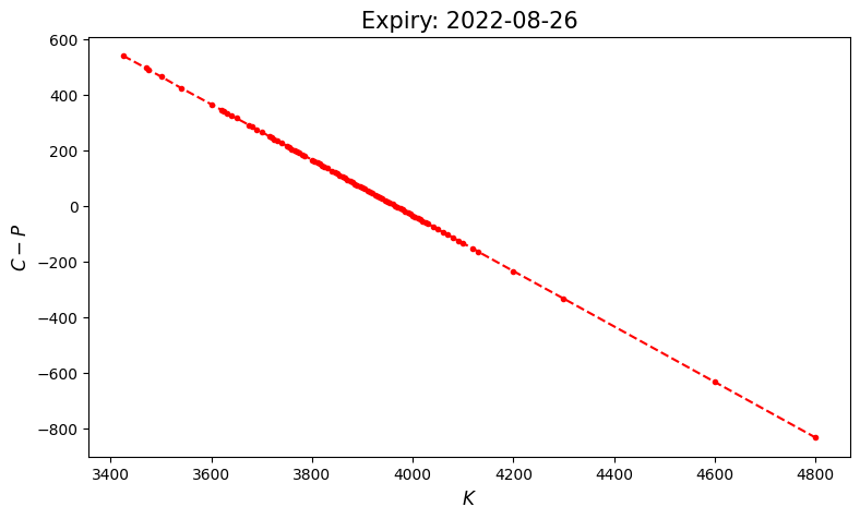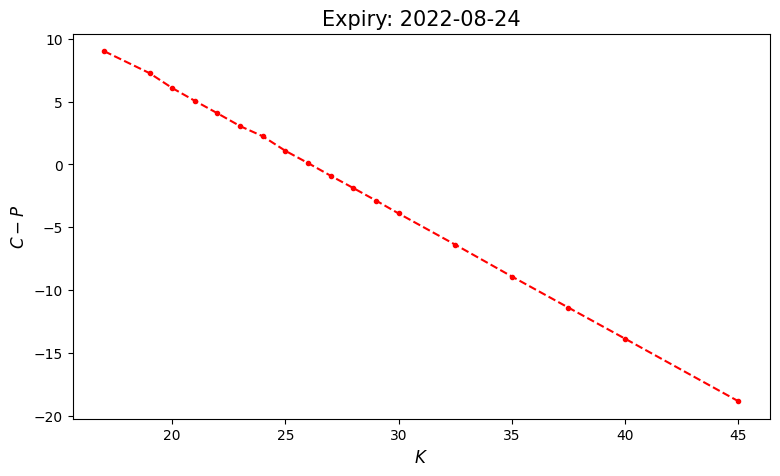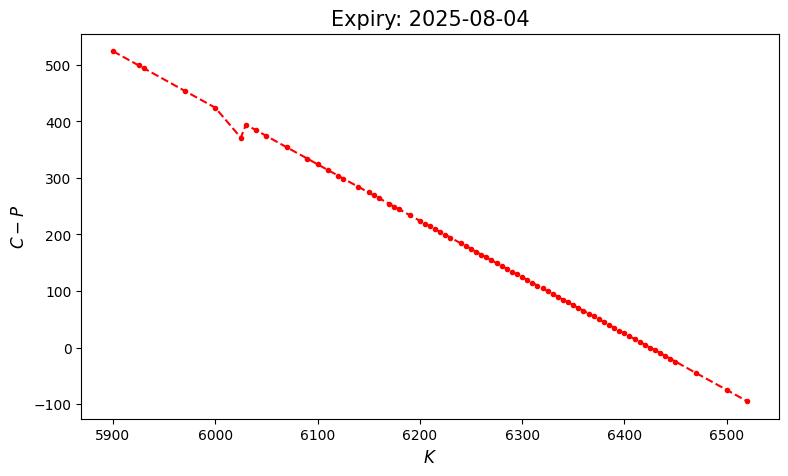 | 隐含远期价格 | \[\hat{F} = K + e^{rT}(C - P)\] | \(F\): 隐含远期价格 |
