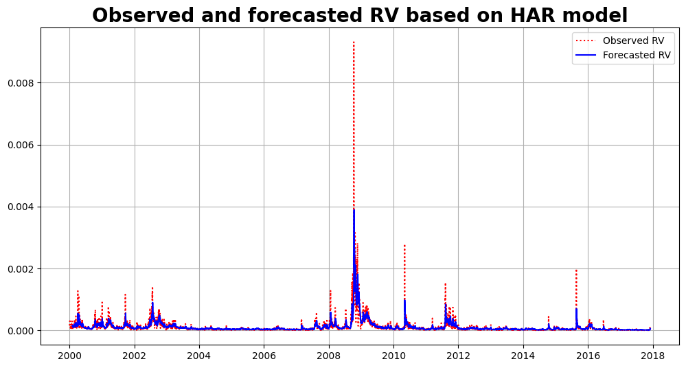 plt.title('Observed and forecasted RV based on HAR model', fontsize=20, fontweight='bold')